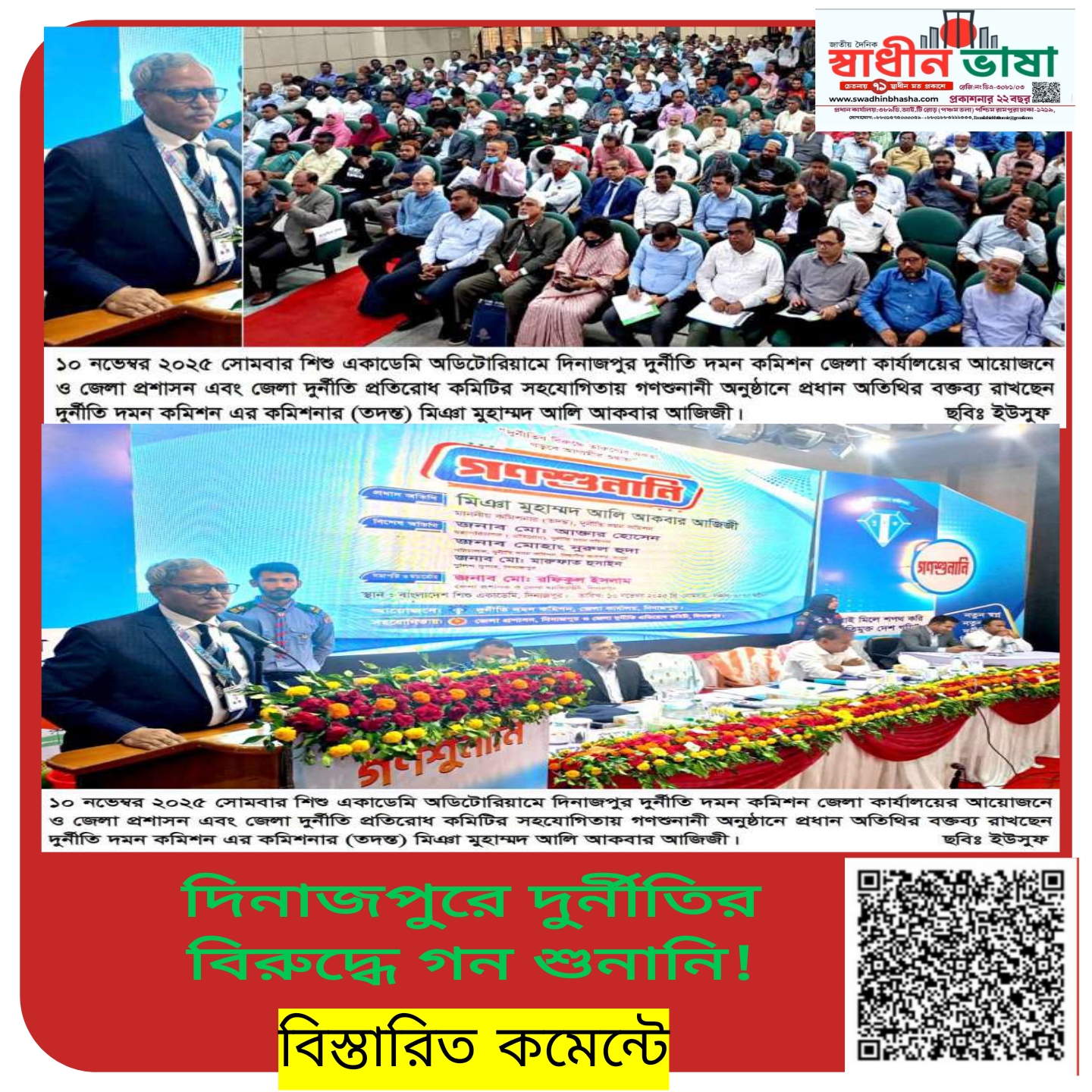 দিনাজপুর শিশু একাডেমি অডিটোরিয়ামের ভেতর তখন দুপুরের আলো। ভিড়ের ভেতর কিশোর শিক্ষার্থীদের চোখে কৌতূহল, সরকারি কর্মচারীদের মুখে এক ধরনের সতর্কতা, আর সাধারণ মানুষের গলায় দীর্ঘদিনের ক্ষোভ। টেবিলের ওপারে বসেছেন কর্মকর্তারা—দুর্নীতির অভিযোগ শুনতে। কেউ সরকারি জমি বেহাতের কথা বলছে, কেউ বলে স্কুলে ঘুষের খরচ। দিনাজপুর দুর্নীতি দমন কমিশনের (দুদক) আয়োজনে এমনই এক গণশুনানির আয়োজন হয়েছে সোমবার (১০ নভেম্বর)।