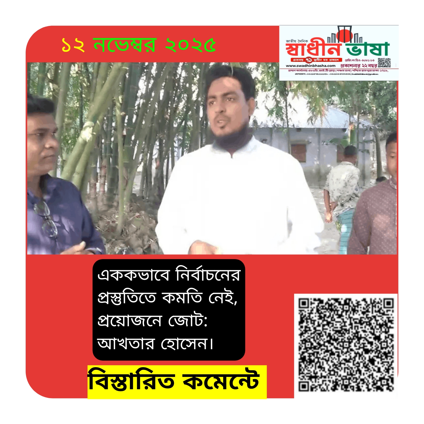 বুধবার (১২ নভেম্বর) দুপুরে গণসংযোগকালে তিনি-এ কথাগুলো বলছিলেন। মাটির রাস্তা ও রাস্তা ঘেঁষে জড়ো হওয়া মানুষের সামনে আখতার হোসেন যেন রাজনৈতিক প্রতিশ্রুতির চেয়েও বেশি কিছু বলছিলেন—বলছিলেন পরিবর্তনের স্বপ্নের ভাষা।