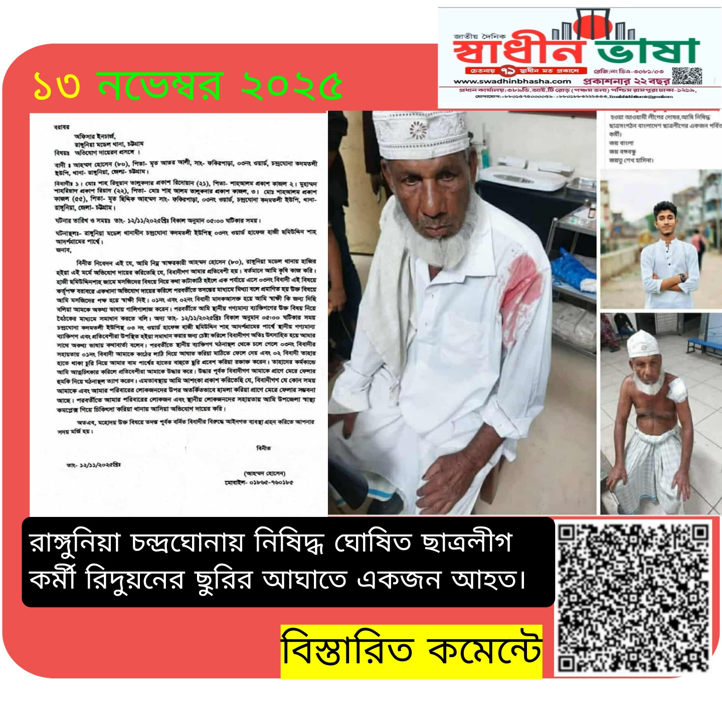 রাঙ্গুনিয়া চন্দ্রঘোনায় নিষিদ্ধ ঘোষিত ছাত্রলীগ কর্মী রিদুয়নের ছুরির আঘাতে একজন আহত।