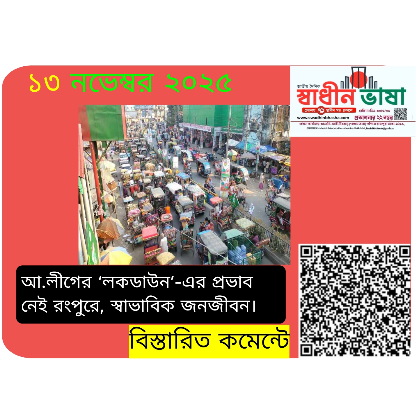 রংপুরের সকালটা আজও ছিল তার চিরচেনা ভঙ্গিতে। সিটি বাজারের ভিড়, পায়রা চত্বরের কোলাহল, জাহাজ কোম্পানি মোড়ের যানজট—সবকিছু যেন এক অদৃশ্য ছন্দে বাজছিল। অথচ এই দিনেই আওয়ামী লীগ ঘোষণা করেছিল ‘লকডাউন’। কিন্তু শহর তা যেন আমলে নেয়নি। মানুষের মুখে নেই আতঙ্কের ছায়া, রাস্তায় নেই শূন্যতার কোন চিহ্ন—বরং জনজীবন স্বাভাবিক ও স্বস্তিময়।