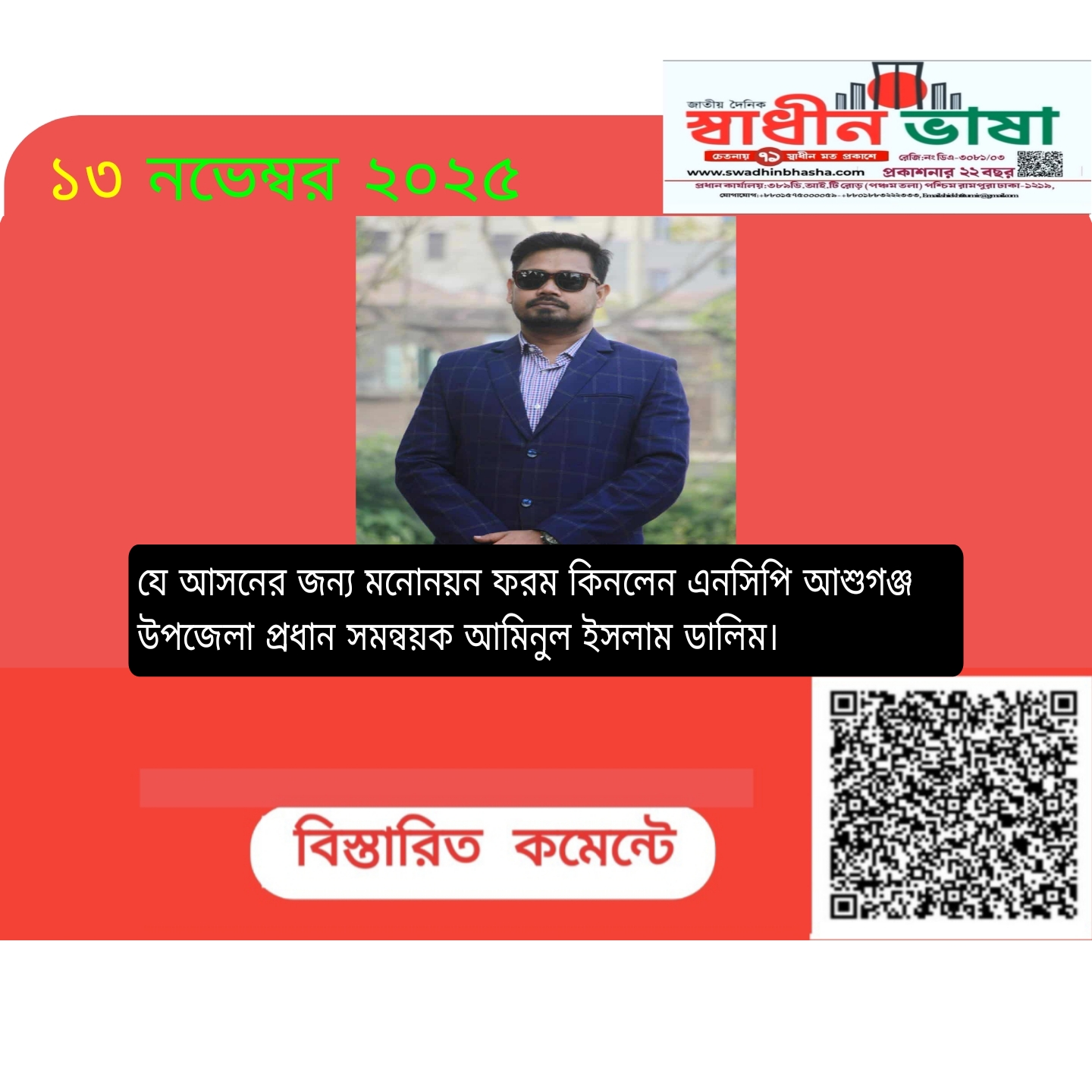 যে আসনের জন্য মনোনয়ন ফরম কিনলেন এনসিপি আশুগঞ্জ উপজেলা প্রধান সমন্বয়ক আমিনুল ইসলাম ডালিম।
